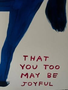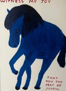 With Untitled (Witness My Joy) (2022), David Shrigley delivers a perfect snapshot of his world: the kind of image that looks simple at first glance, then quietly rewires itself in your head. A bright blue horse—tender, odd, slightly awkward—becomes the messenger for a statement that reads like a blessing and a demand at the same time: witness my joy… so that you may be joyful too. Shrigley’s genius is how he makes big emotions feel both universal and absurd, balancing sincerity with a wink of discomfort.