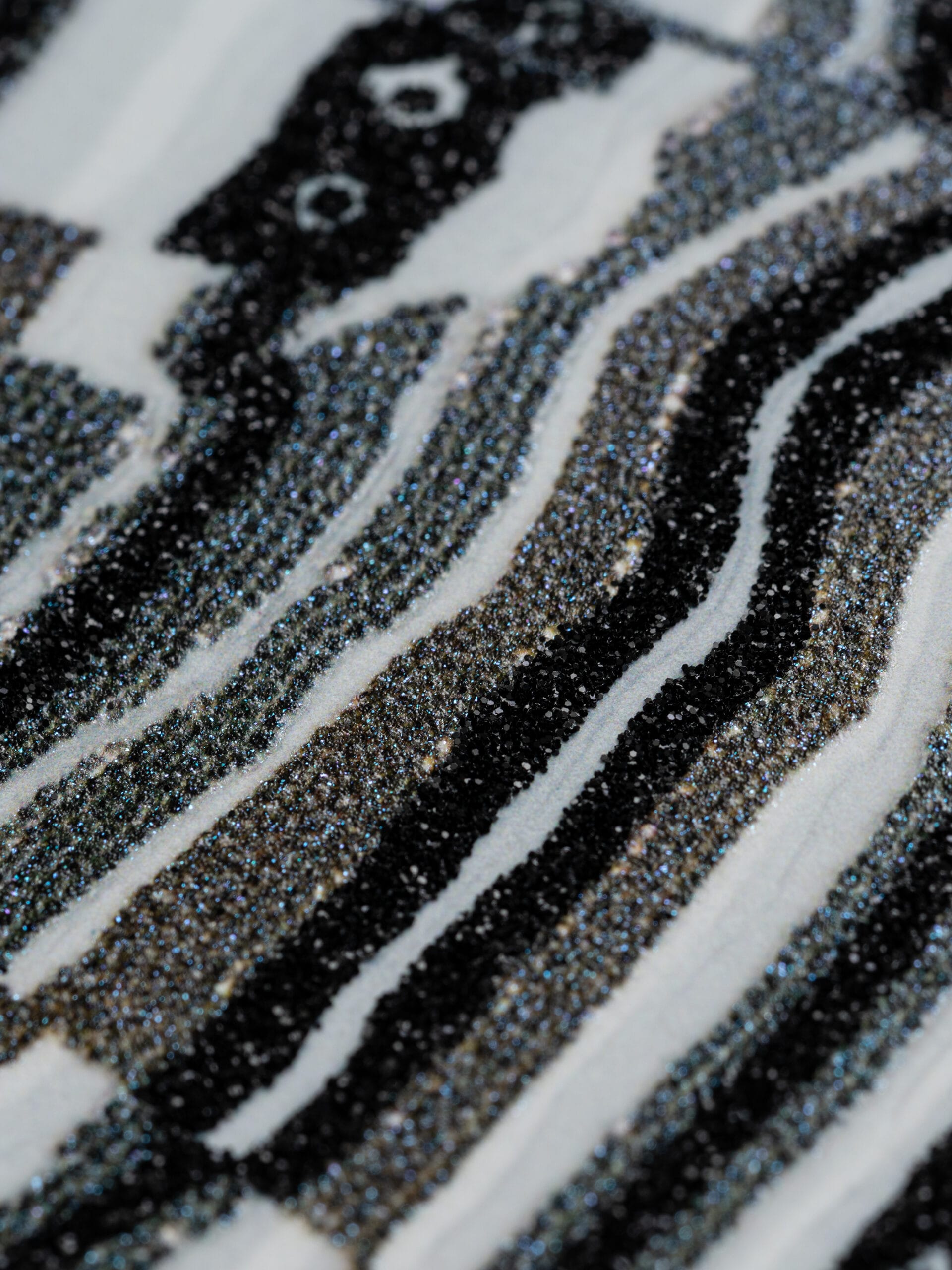 The edition’s finishing is integral to the experience. Metallic silkscreen glitter and shimmer layers, a CMYK silkscreen central panel, and a matte varnish seal create shifting highlights across hair, clothing, and the central “revealed” section—so the work subtly changes as light moves across it.
